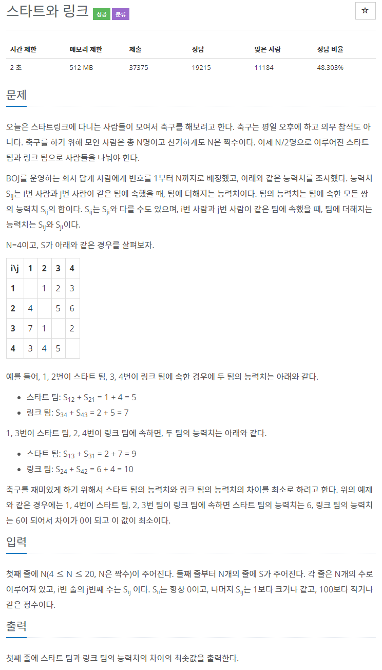 각 팀에 N/2명씩 나누었을 때 사람들 끼리 가지는 시너지를 계산하여 팀 사이의 능력치 차이가 가장 적도록 하는 문제이다. 예를 들어 1번 선수와 4번 선수가 같은 팀일 경우 table[1][4] 와 table[4][1]을 팀 능력치에 더해주면 된다.