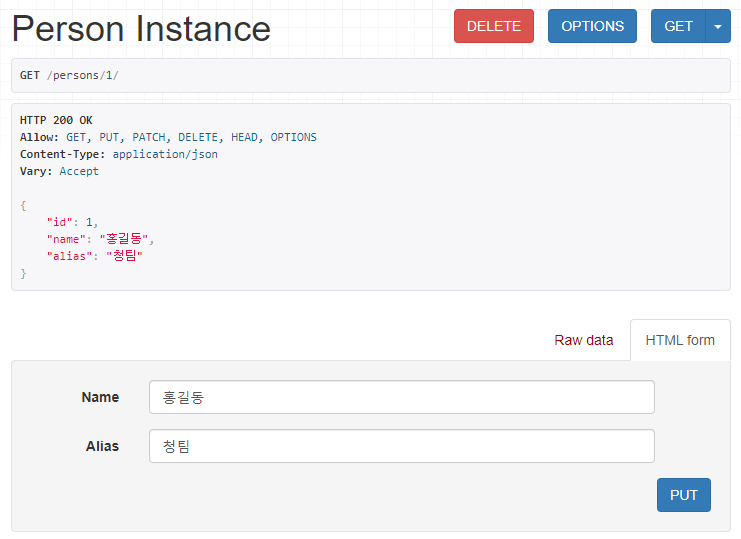 READ, UPDATE, DELETE / http://127.0.0.1:8000/persons/1 을 입력하고 들어가면 id가 1인 인스턴스의 정보가 표시되고, 아래에 이 정보를 수정할 수 있는 항목과, 상단에 인스턴스를 지울 수 있는 버튼이 표시된다.