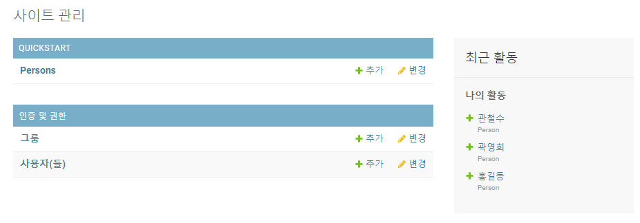 이제 admin 사이트에서 Person이라는 모델의 인스턴스를 직접 생성할 수 있다. 간단하게 몇가지 Person 인스턴스를 생성해보았다.