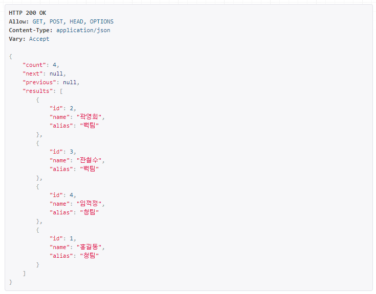 http://127.0.0.1:8000/persons/ 를 클릭하고 들어가면, 아까 이전 단계에서 임의로 생성했던 Person 모델의 인스턴스들을 확인할 수 있다.